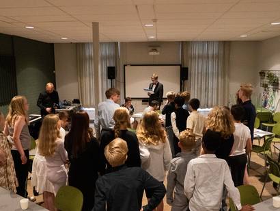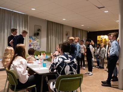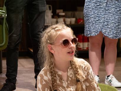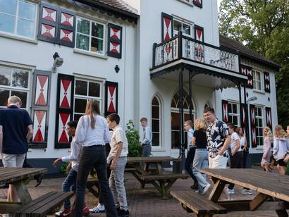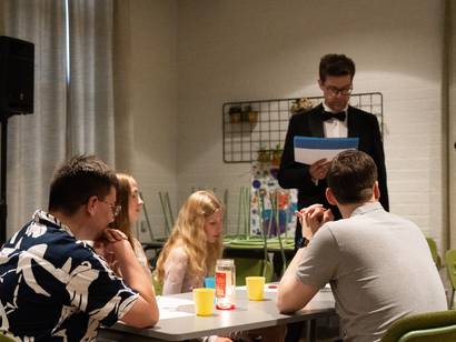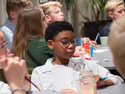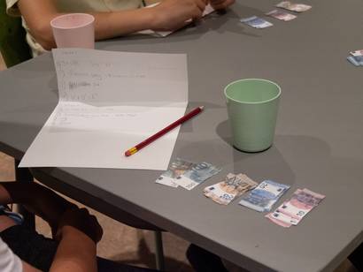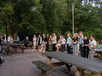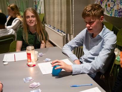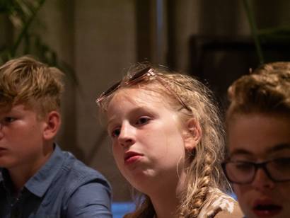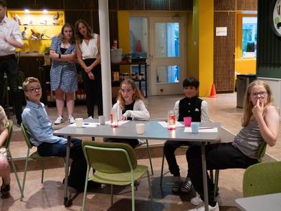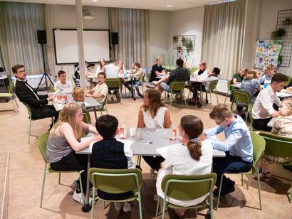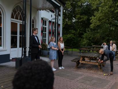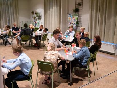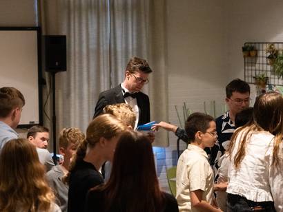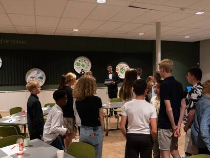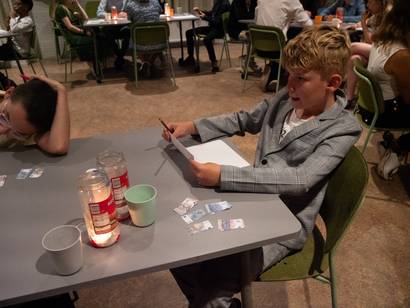 We weten natuurlijk dat alle ouders ook meelezen in dit dagboek. Dan is het leuk dat we allemaal referenties doen naar TV-programma's, maar dat kennen die oude lui niet. Daarom speciaal voor de ouders een programma van Omroep Max: Met het mes op tafel! We kregen de opdracht om ons allemaal netjes aan te kleden, om daarna naar het cafe te gaan. In pak, overhemd, jurk of gewoon een net shirt en met een dikke laag make-up liepen we het cafe binnen. Daar speelde een pianist, meneer Marcel, en werden we verdeeld over speltafels met iedere tafel een eigen croupier. Iedere ronde zetten we geld in om deel te nemen. Daarna stelde de hoofd-croupier, meneer Wouter, vier vragen. Vervolgens gingen de pennen neer en konden we tegen elkaar opbieden. Iedereen die aan het einde van de biedingsrondes nog niet hadden gepast, lieten hun antwoorden zien. Heb je de meeste antwoorden goed? Dan ging je er vandoor met de pot. Dat was een spannende avond in het cafe!