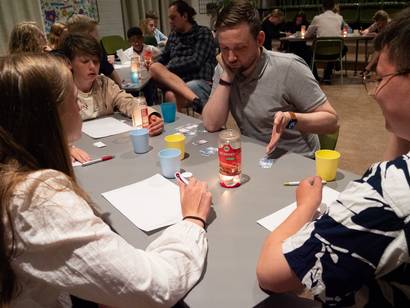 Vanavond hebben we een mollenspel gespeeld waar de kleuren echt om je oren vlogen. Dan dacht je dat Juliatoren tolde, maar dat viel hierbij in het niets. We gingen op stoelen staan, achter stoelen staan, dan weer doorschuiven en kroop ik nou ook onder de stoel door? Ik tol nog. En dat allemaal op kleur.