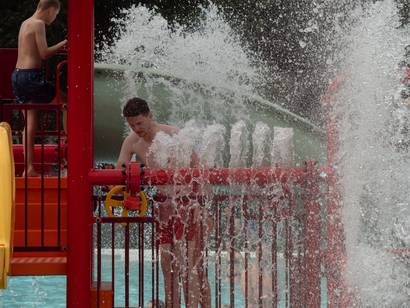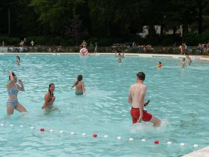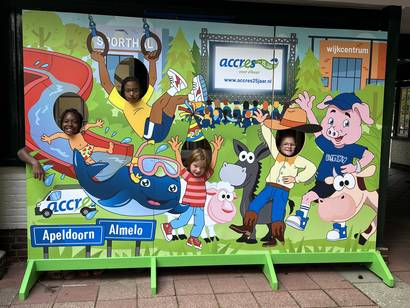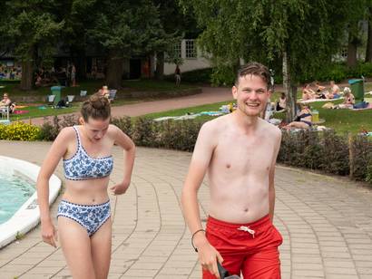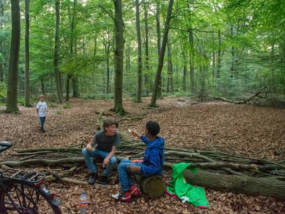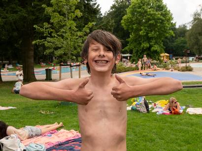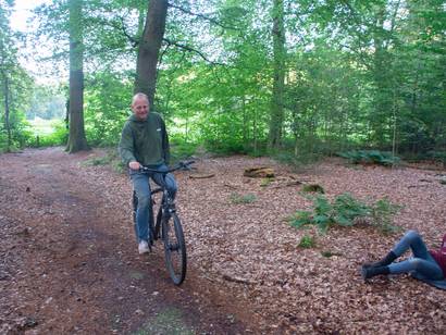 De B was op de fiets en dat ging een beetje gek. We stopte telkens onderweg en dan ging Keynai rustig een verhaal staan de vertellen. Over auto's, bomen en huizen. Die had duidelijk geen haast om te gaan zwemmen. Op de terugweg bleef ie bezig. Tijdens zijn college over een huis kwam er opeens een man naar buiten die zei dat we kalm en rustig moesten doen, want in Apeldoorn is groen en er wonen allemaal oude-vandagen. Heel vreemd.